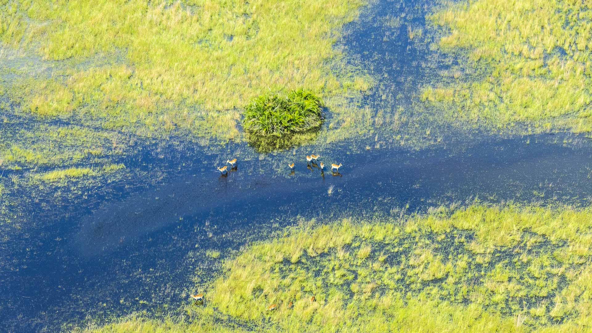 The Okavango Delta – It is almost fictional, the story of the Okavango delta. As great a river as any…except for that its water never reaches the ocean. Instead, the channels disperse into a 15 000 km² labyrinth of papyrus, white sands, crystal clear channels and palm belts. An oasis-like paradise, a place like no other. It is for good reason, therefore, that the Delta has been proclaimed one of Africa’s seven wonders, and officially recognised as a UNESCO world heritage site. Not only is this landscape as unique as it is beautiful, it also home to vast numbers of wildlife and colourful birds. Canoeing the channels can be an exhilarating introduction to the bubbling pods of hippo and prehistoric crocodiles dwelling in the waterways, whilst driving on safari will exhibit an endless array of fauna and flora, big and small. Often, though, it is only by air that one can grasp what an extraordinary place the Okavango really is. A woven landscape or glittering channels and green reeds, dotted by herds of elephant and buffalo in the hundreds.