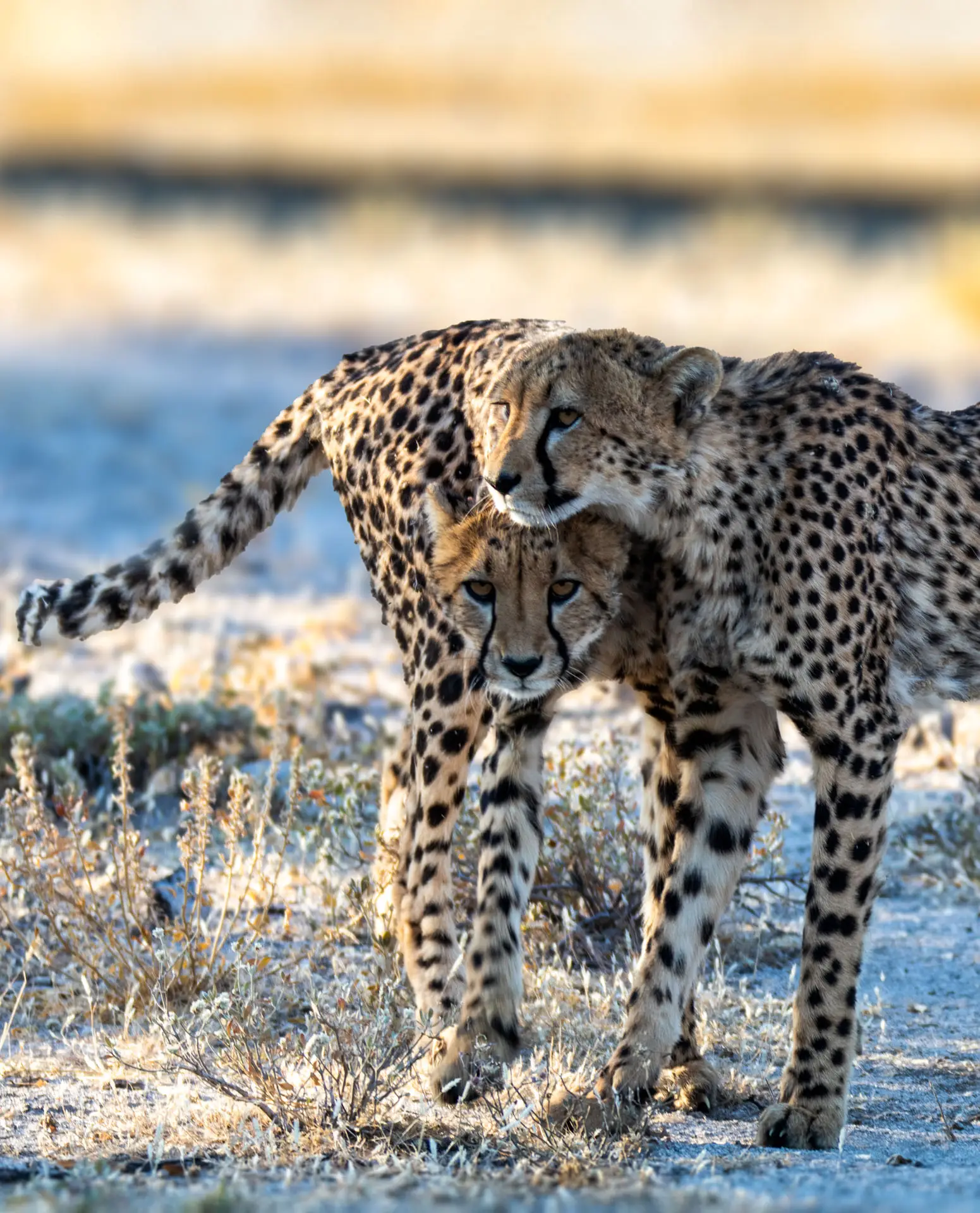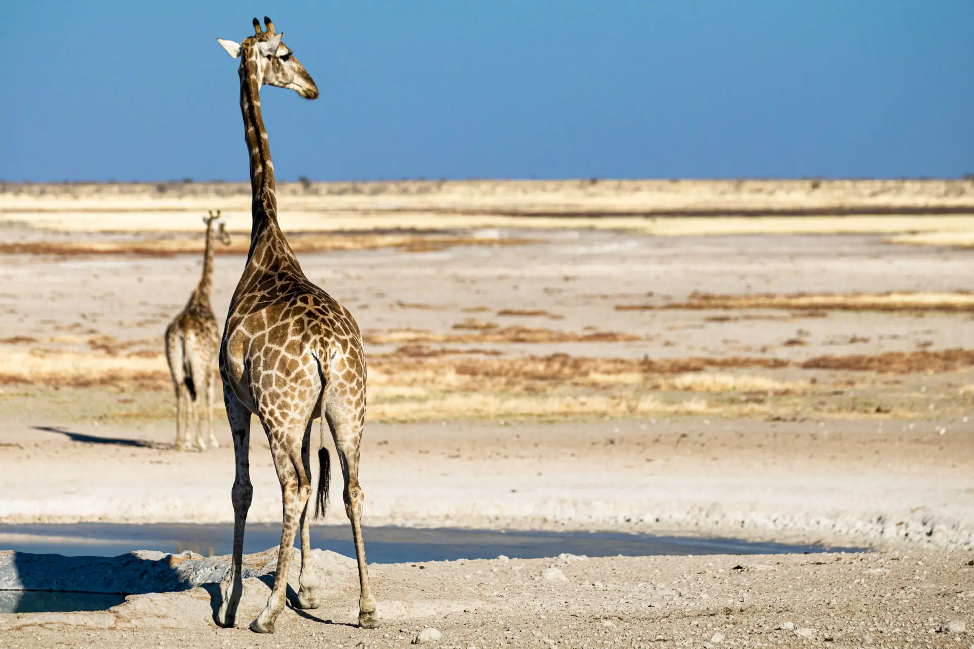 Etosha – Namibia is a country of red, white, yellow and blue. The red sands in the south are a stark contrast with Etosha National Park’s dazzlingly chalk-white lunarscapes, in the far north. And yet both ecosystems share the endless, deep, blue sky that is so synonymous with Namibia. Etosha National Park is Namibia’s greatest wildlife sanctuary, named after the vast Etosha salt pan that traverses it, covering almost a quarter of the National Park. In the summer, flamingos and pelicans flock to the hyper-saline pan as it briefly fills with water. During winter (dry season), the wind spreads saline dust across the country, which delivers mineral enrichment to the soil. This also highlights the fascinating interactions between mineral, floral and faunal components of the ecosystem. The dry season provides wonderful game viewing opportunities as vast numbers of animals, such as zebras and springbok, white rhinos, elephants, lions, jackals and hyenas of all sorts congregate at the waterhole.
