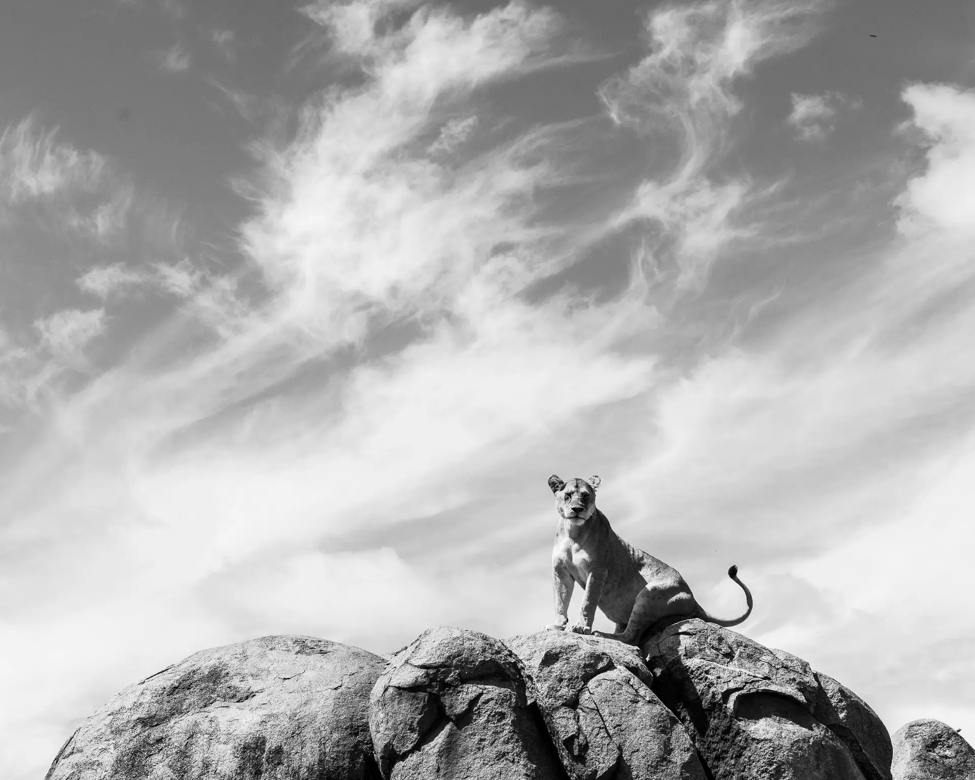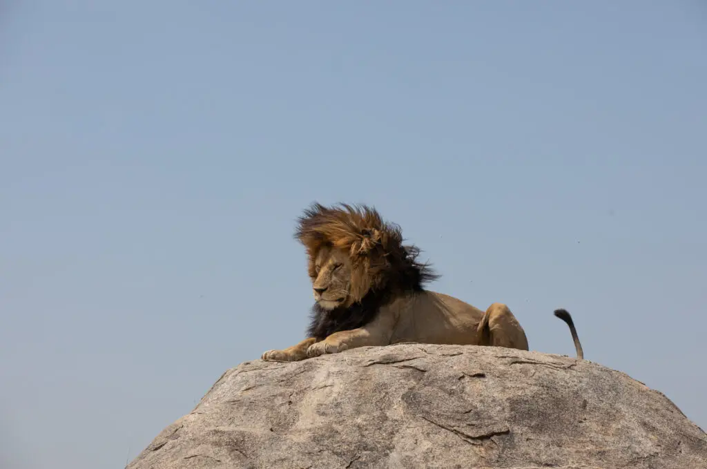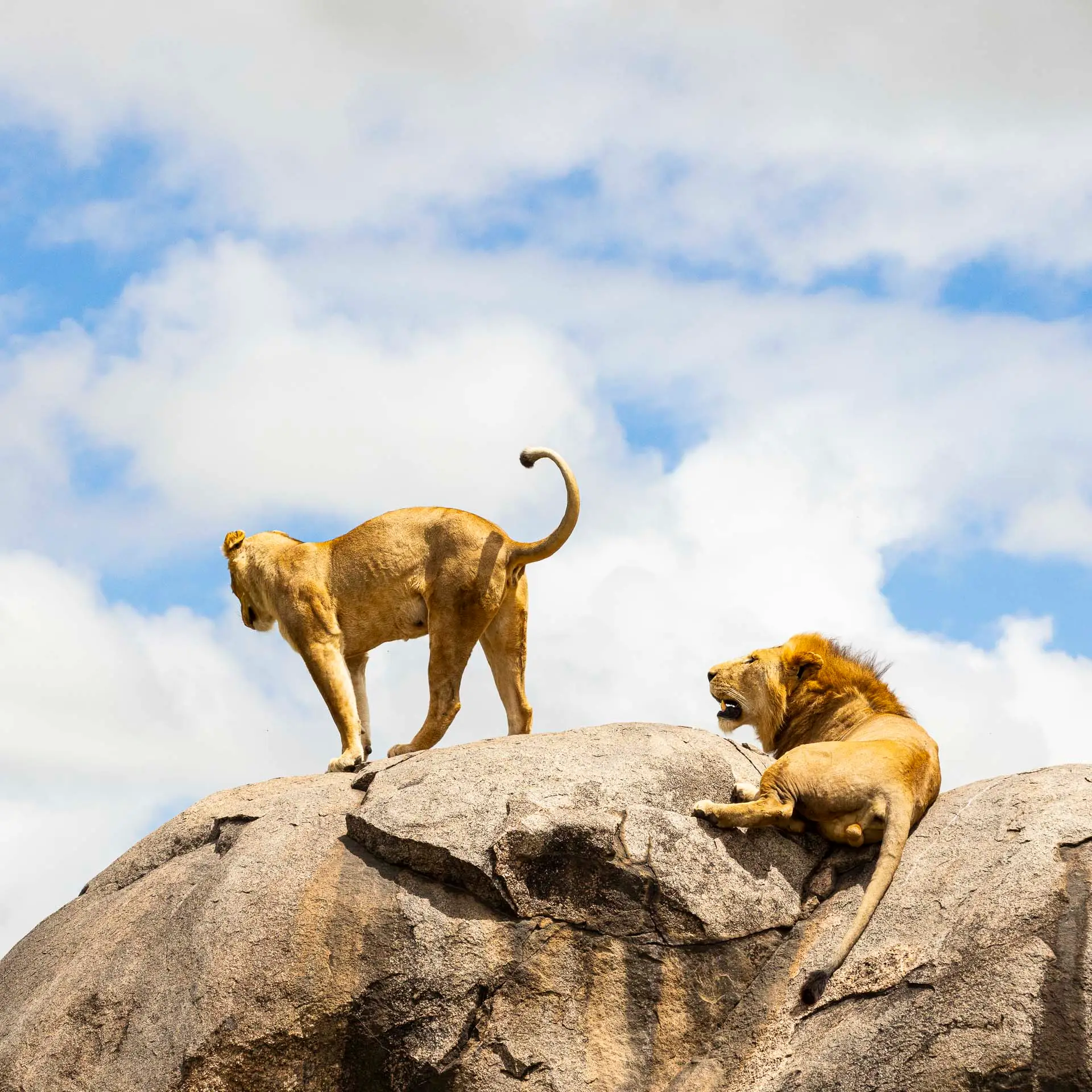 Monolithic rock outcrops, big cats atop, surround by the vast gold of the Serengeti grasslands