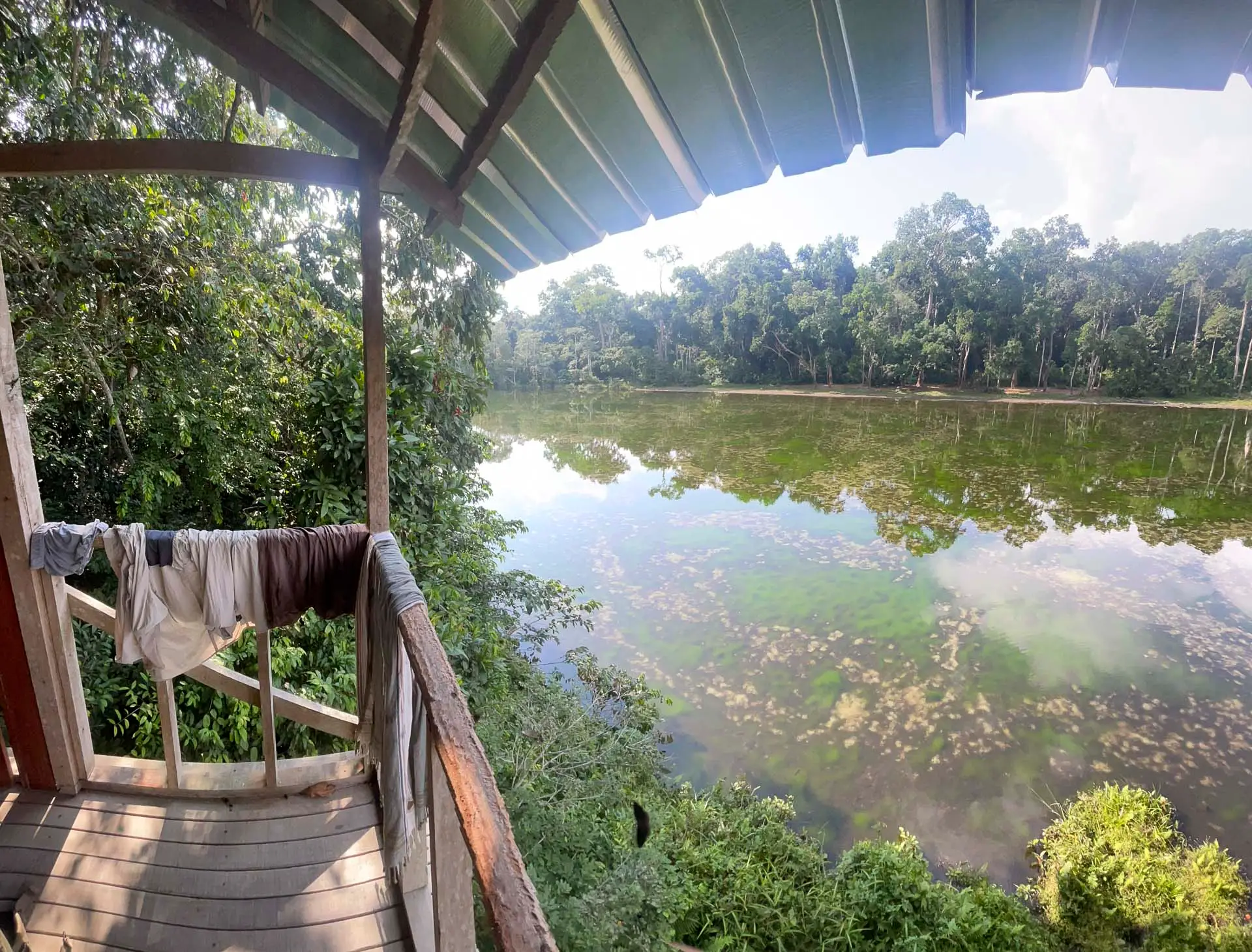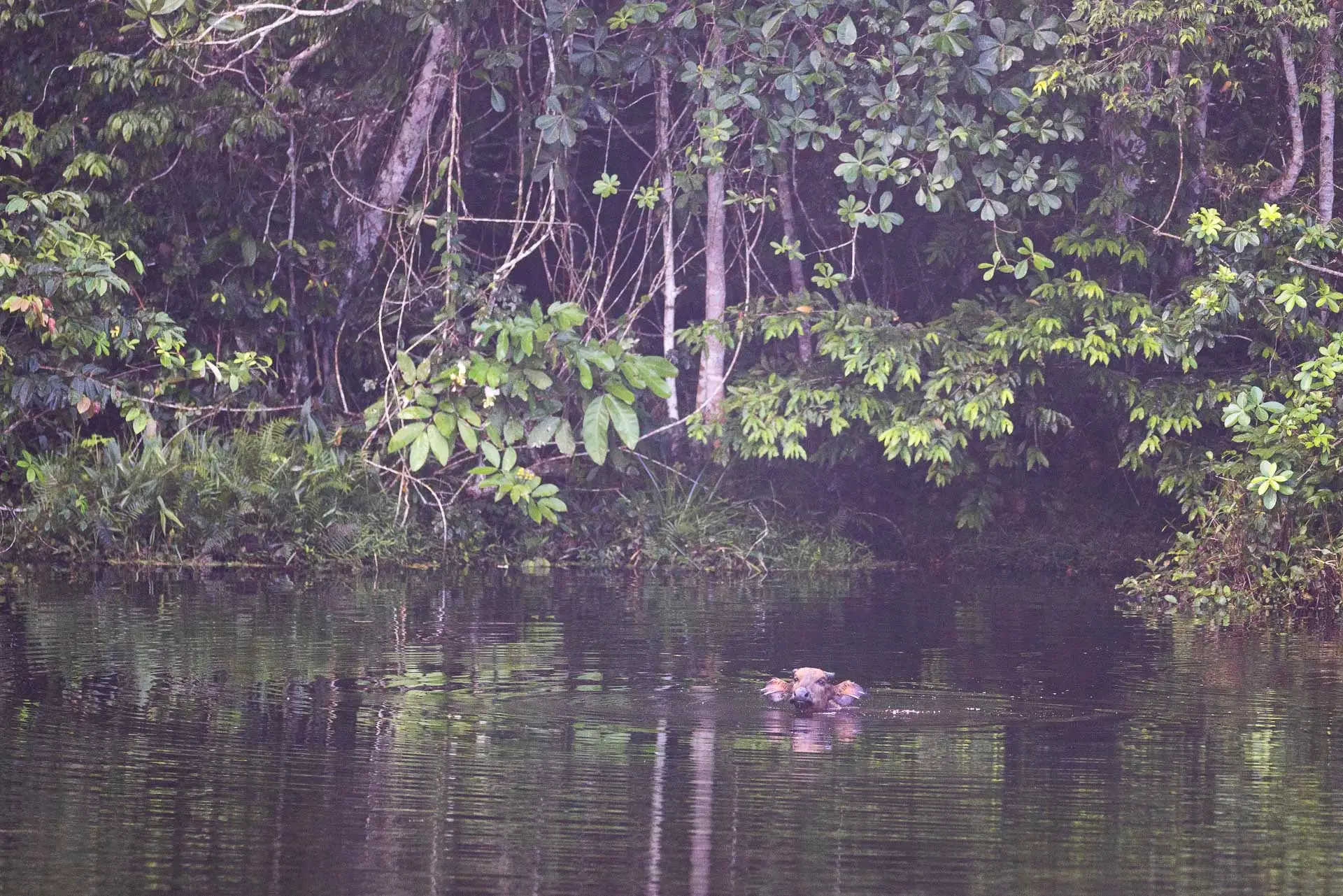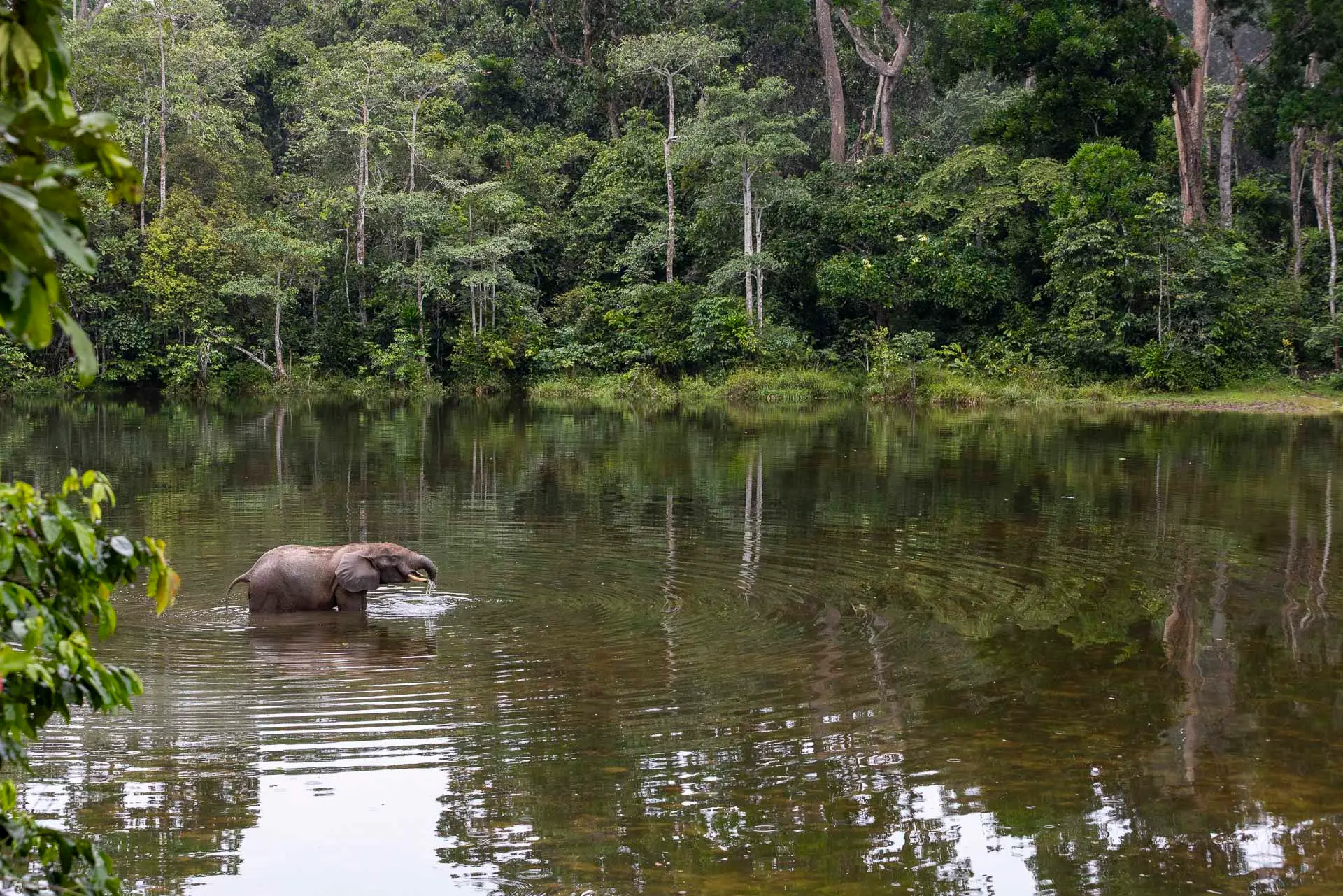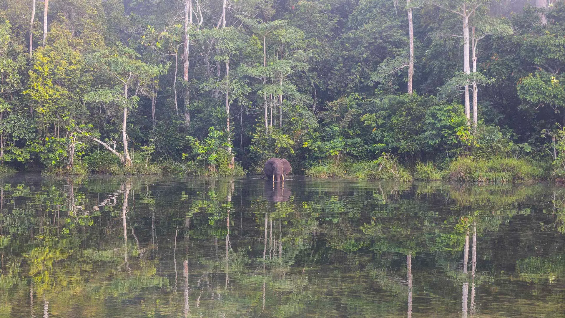 A bai submerged in crystal clear water, visited by shy colobus and forest elephant